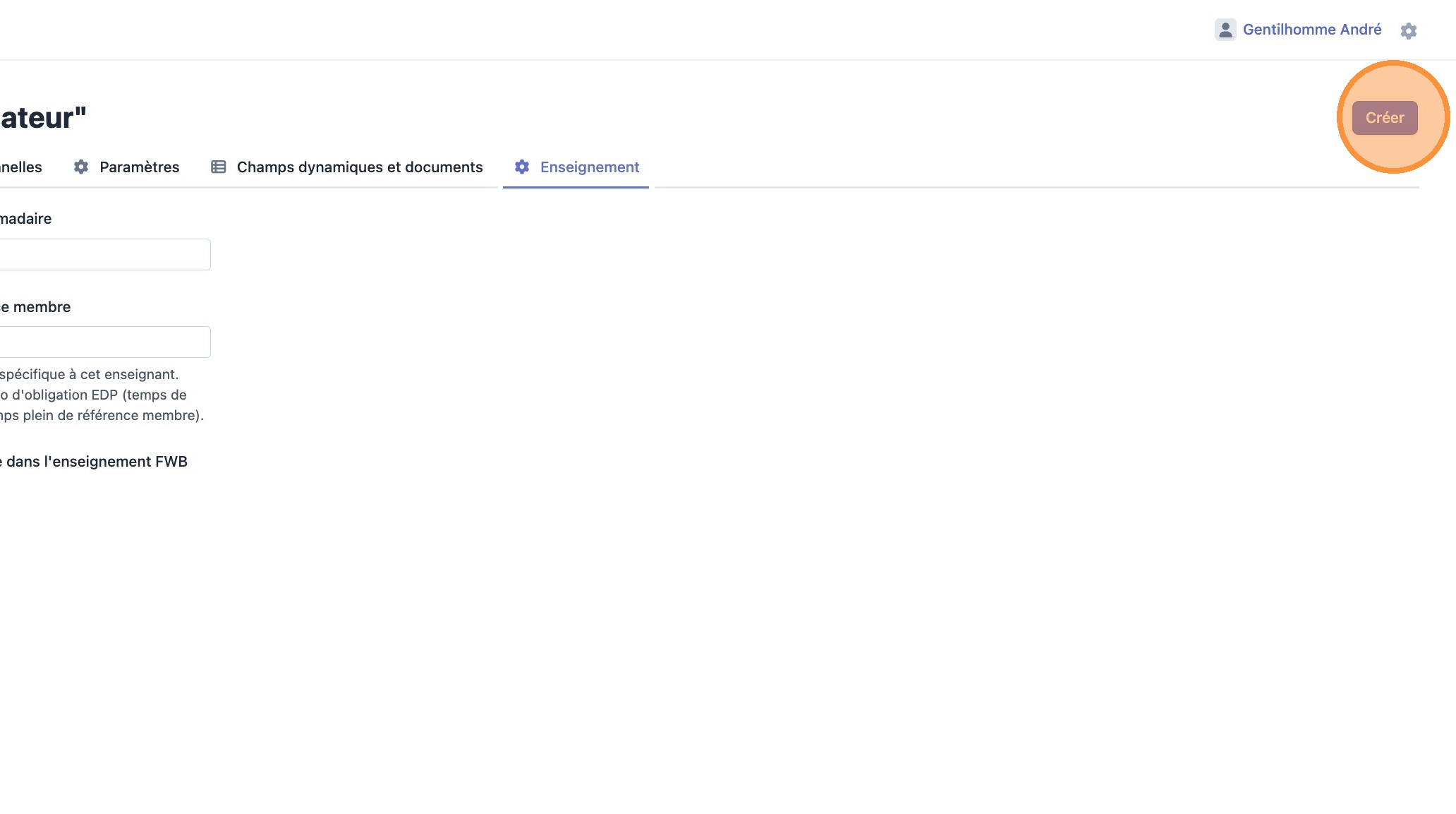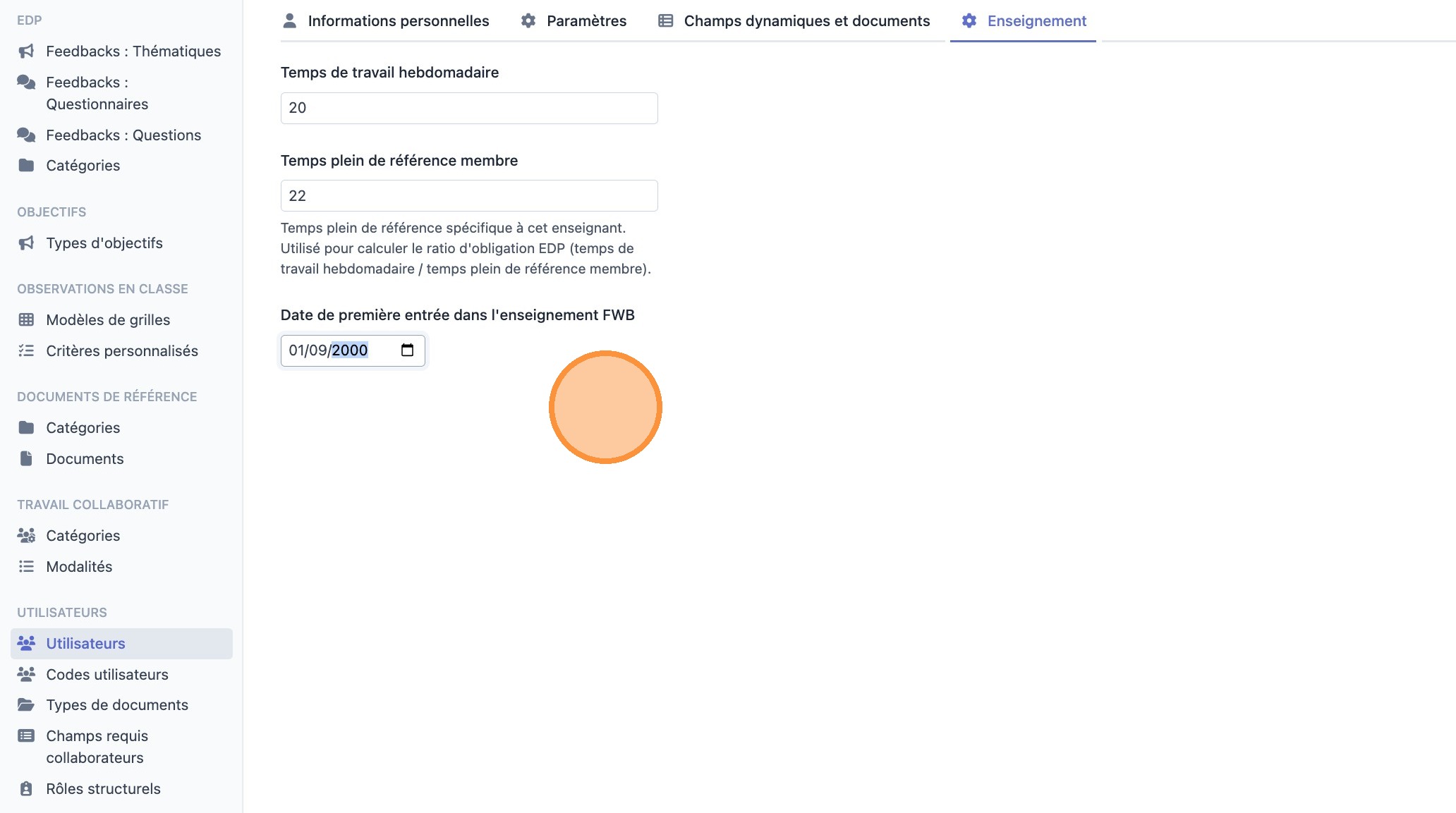 5. Pour les écoles, l'onglet ENSEIGNEMENT est très important car c'est là que l'on encode le temps de travail hebdomadaire ainsi que le temps plein de référence. Ces deux données servent à calculer si le membre est soumis à un EDP (charge >= 0,5) ou non. Aussi, on utilise ce ratio pour définir le minimum de périodes de travail collaboratif requis par le décret. La date de première entrée dans l'enseignement FWB est encodée ici. Elle sert à définir le type d'EDP (annuel pour les enseignants de moins de 5 ans d'ancienneté ou triennal pour les autres.