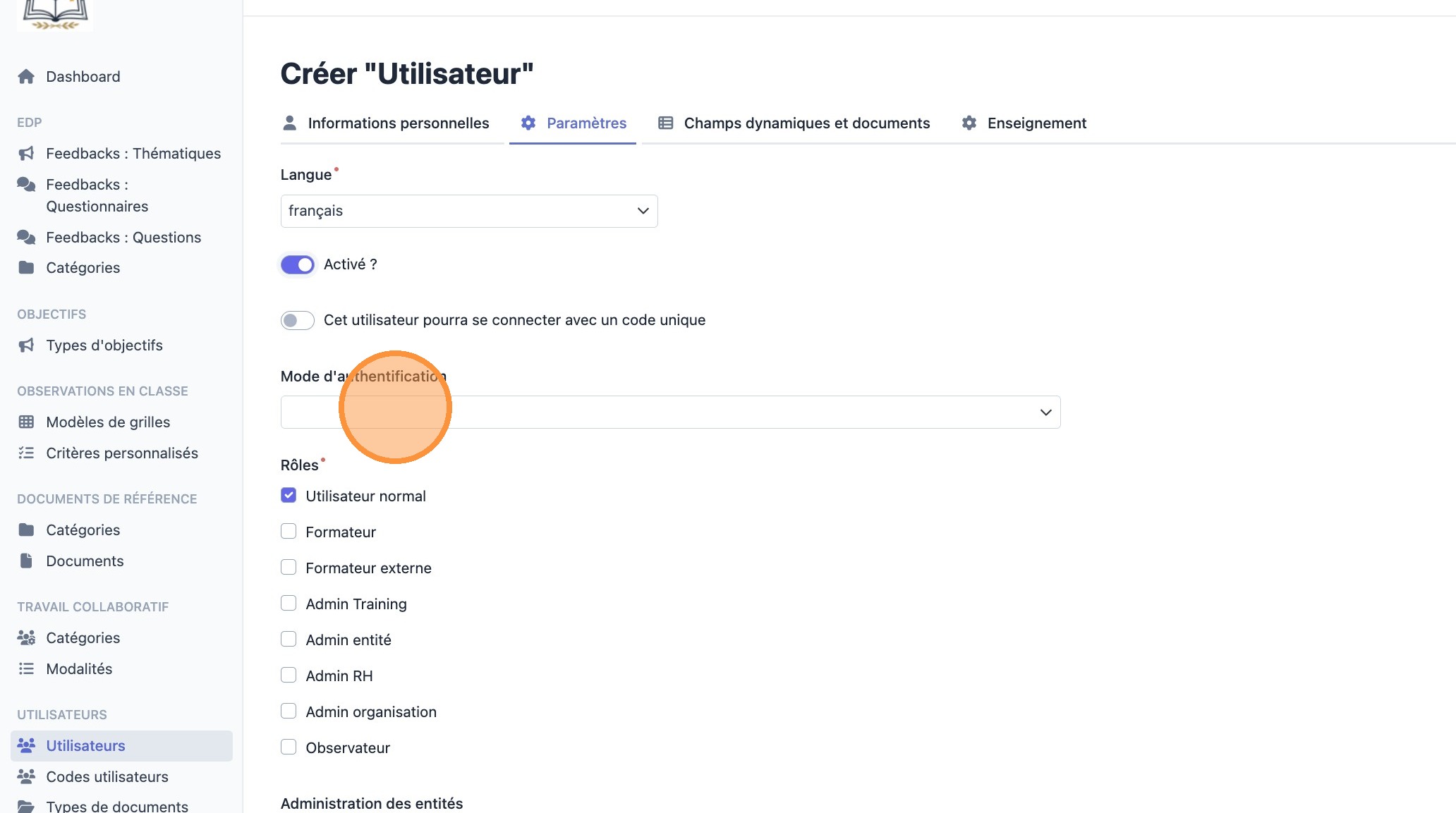 4. Cliquer sur l'onglet "Paramètres" pour compléter la langue par défaut de l'utilisateur (FR-NL-EN-IT-ES), l'activation de l'utilisateur, son mode d'authentification (par mot de passe, compte Google, compte Microsoft) ainsi que son profil de droits.