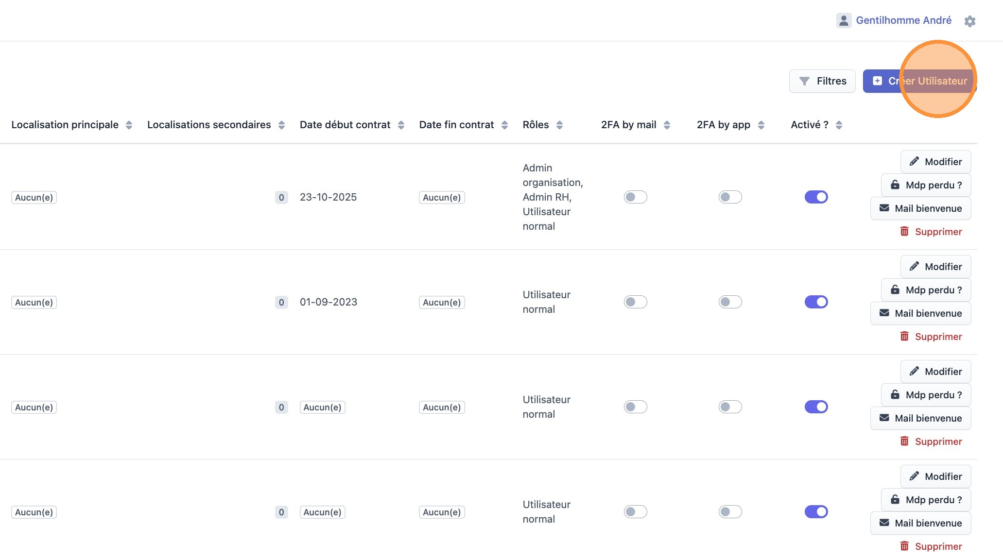2. Cet écran affiche tous les utilisateurs de votre organisation. Quelques détails sont repris en colonnes mais pour accéder à la fiche utilisateur, cliquer sur MODIFIER. Pour créer un nouvel utilisateur, cliquer sur CREER UTILISATEUR.