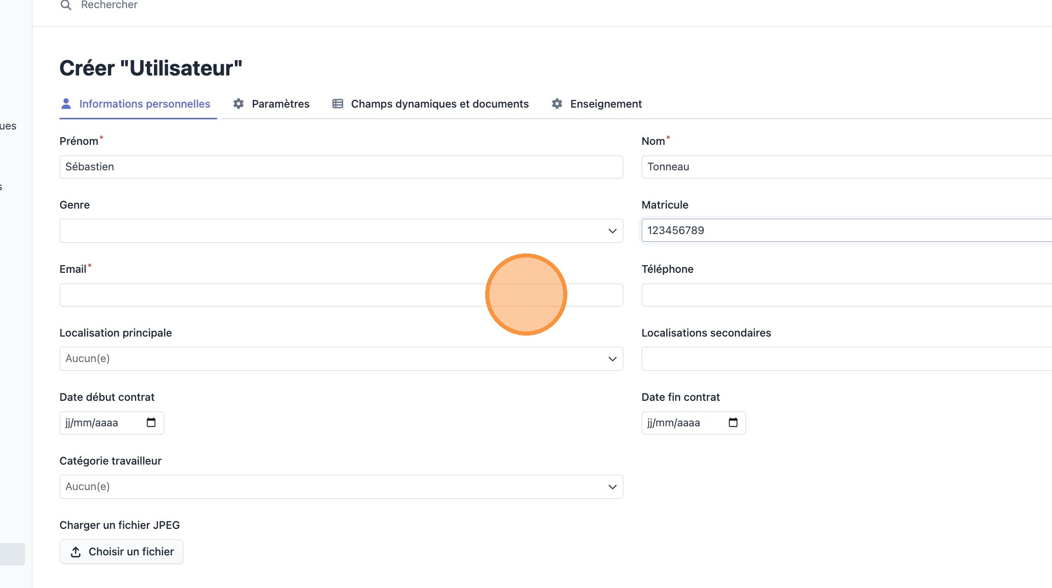3. Renseignez les informations personnelles. Champs obligatoires dans cet onglet: prénom, nom, email. Pour l'enseignement, le matricule à encoder ici est celui de la Fédération Wallonie-Bruxelles.