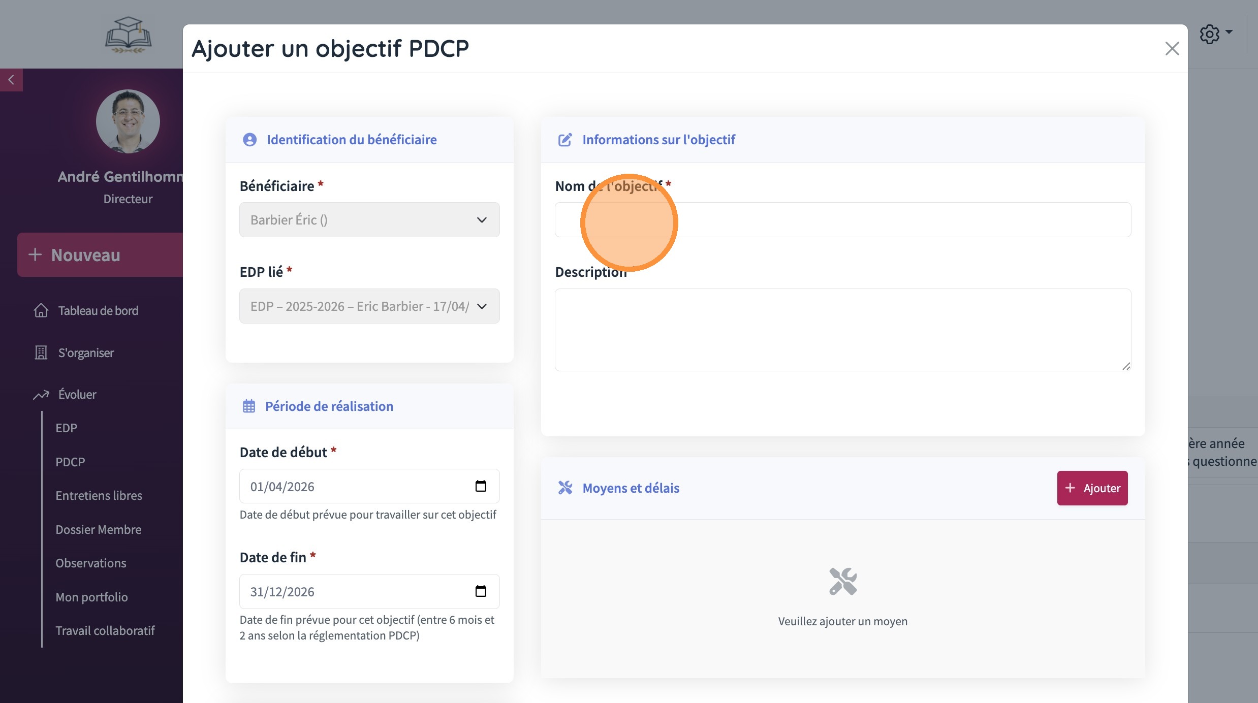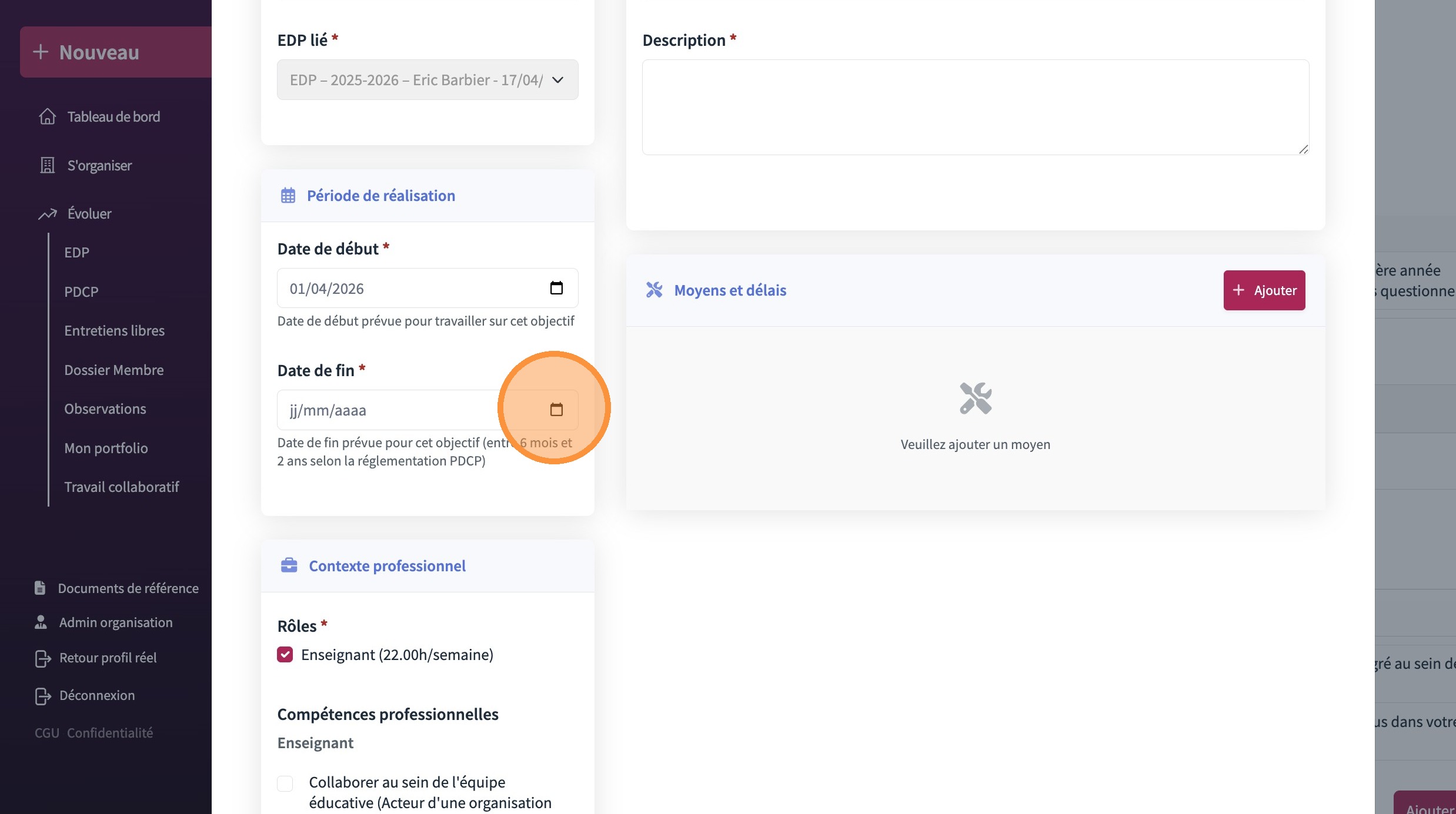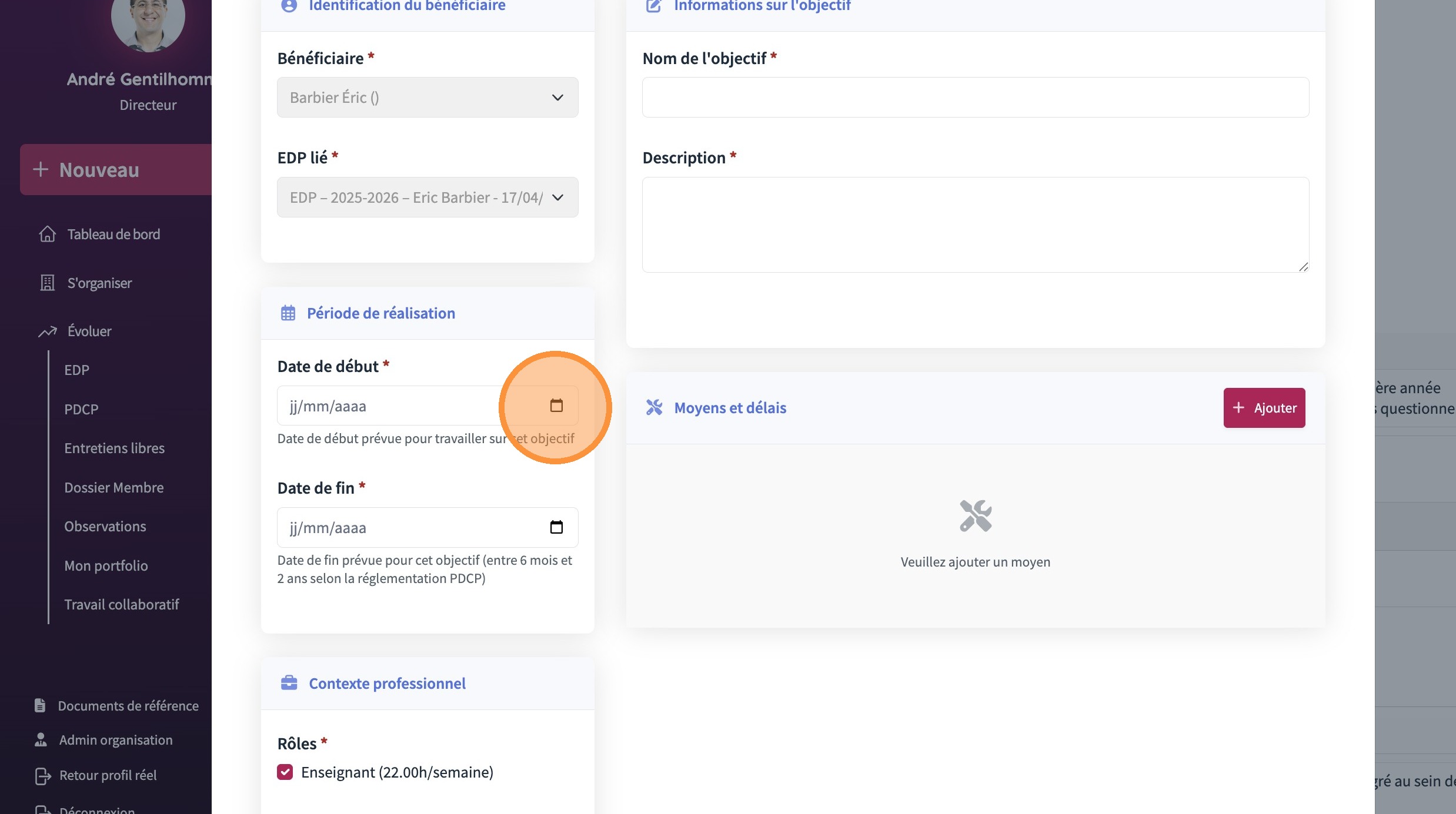 Ce guide fournit une procédure étape par étape pour ajouter et enregistrer des objectifs PDCP dans un entretien EDP. Il décrit les détails essentiels tels que les dates de début et de fin, la sélection des rôles et le choix des compétences.
