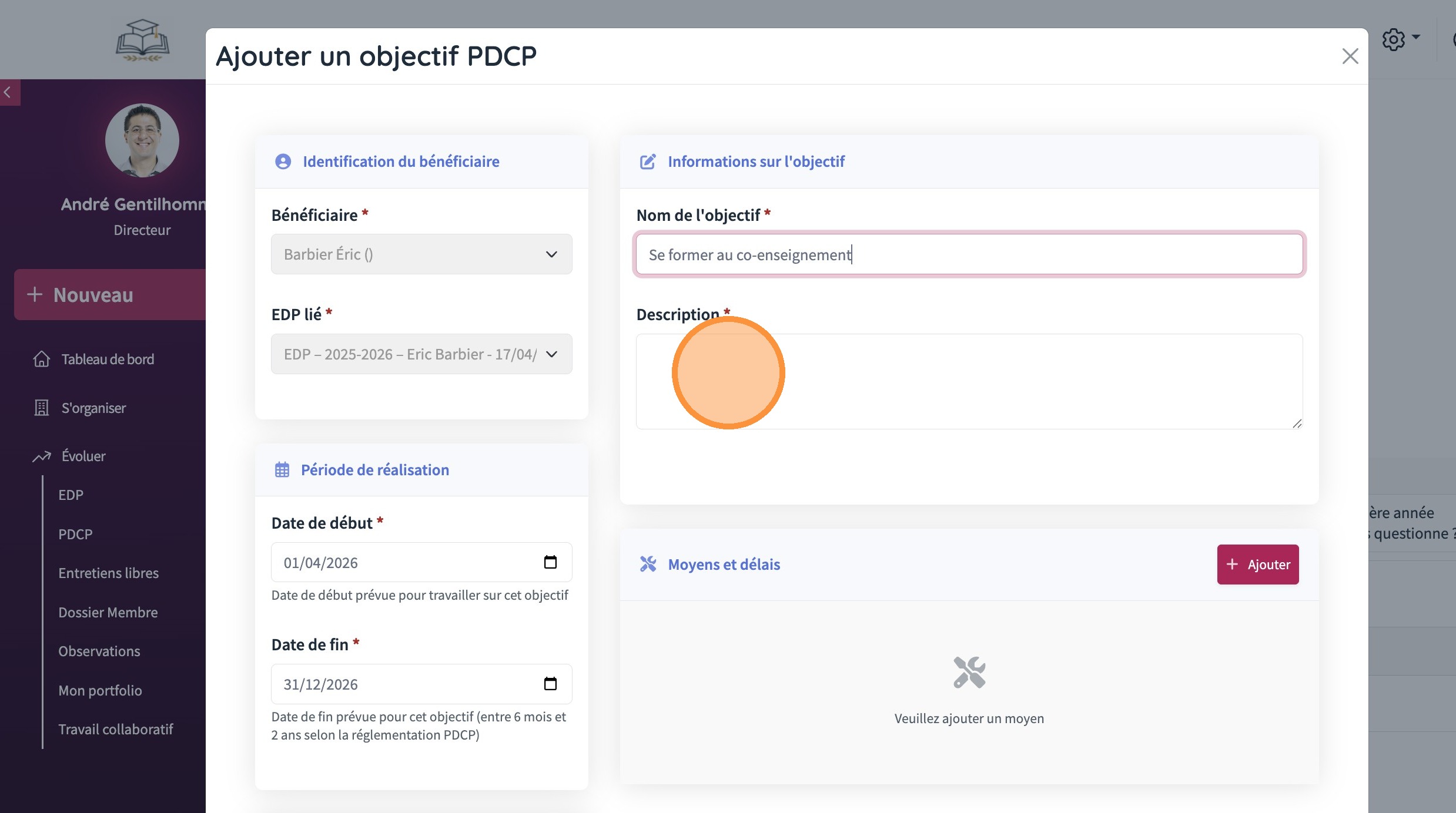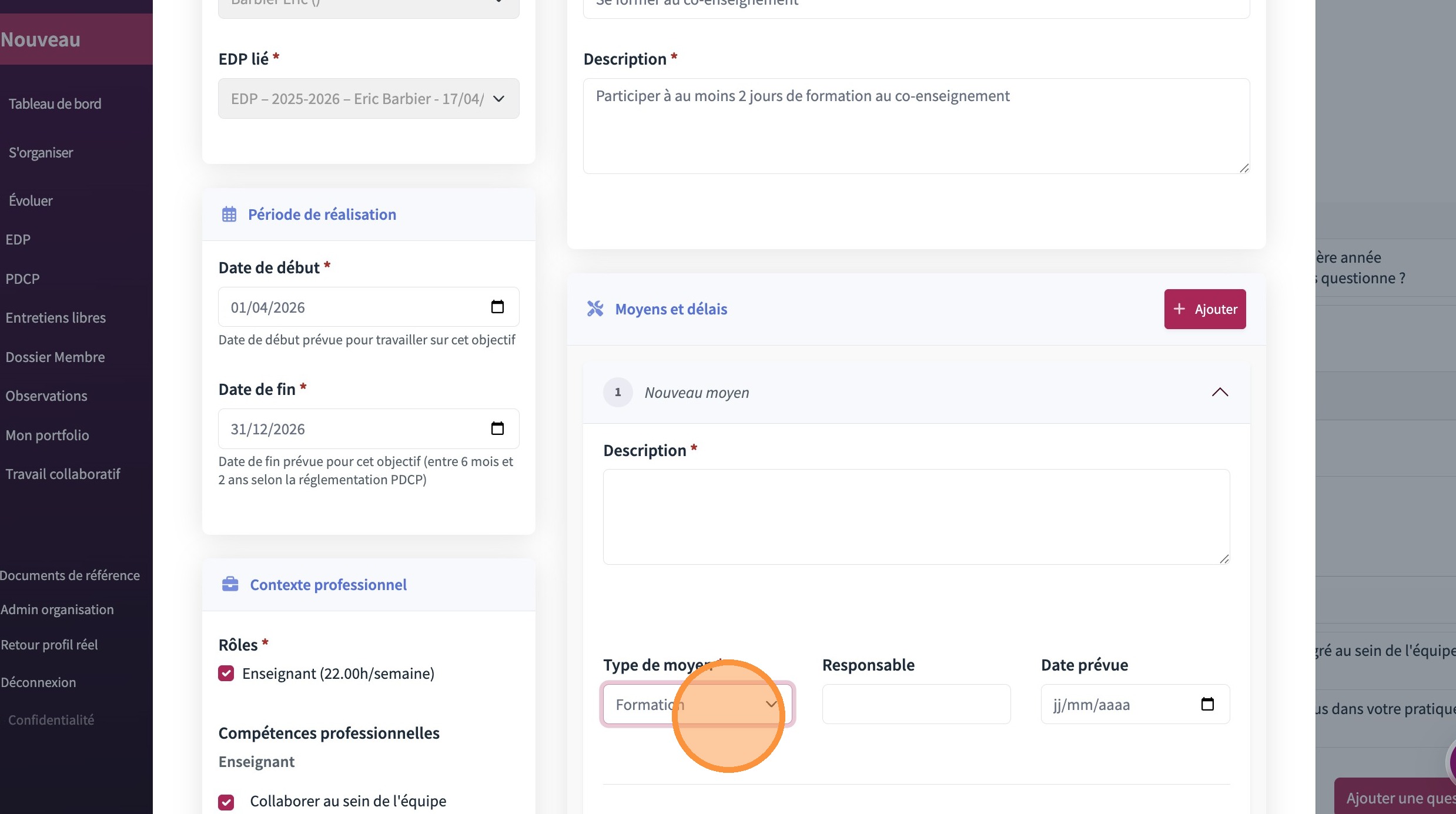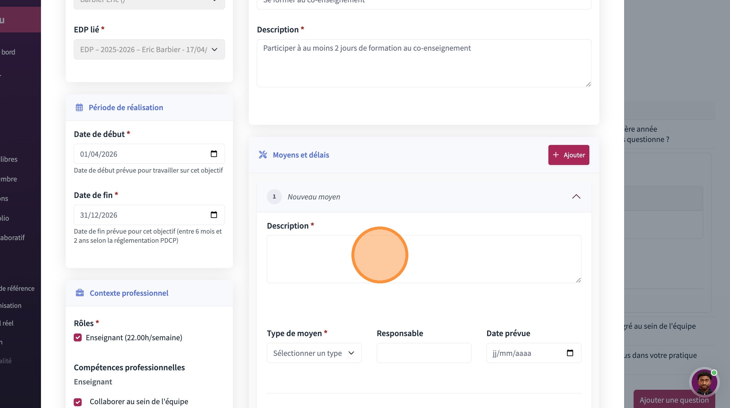 Ce guide fournit une procédure étape par étape pour ajouter et enregistrer des objectifs PDCP dans un entretien EDP. Il décrit les détails essentiels tels que les dates de début et de fin, la sélection des rôles et le choix des compétences.