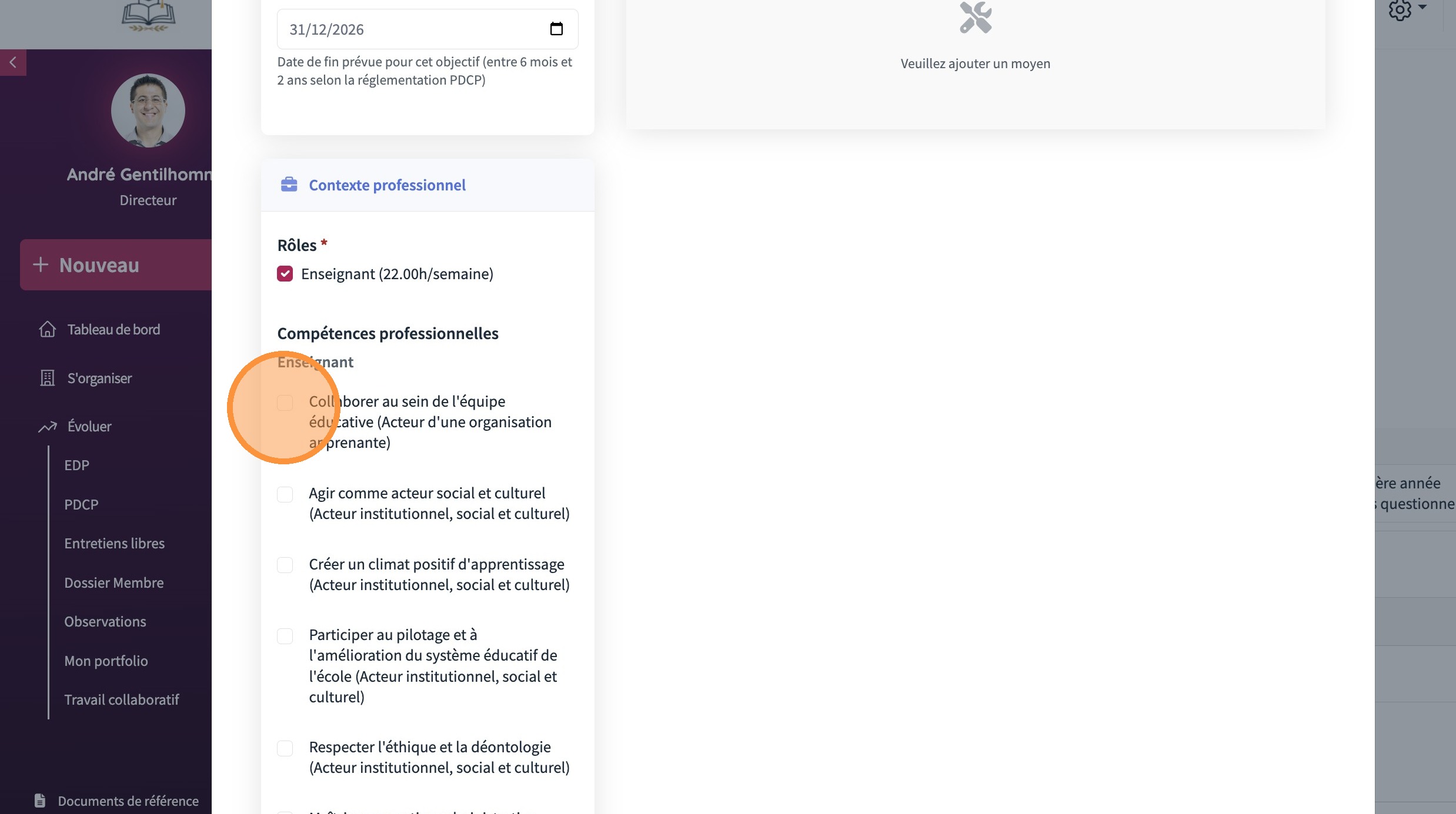4. Vous pouvez sélectionner un rôle. Vous pouvez aussi choisir une ou plusieurs compétences du décret.