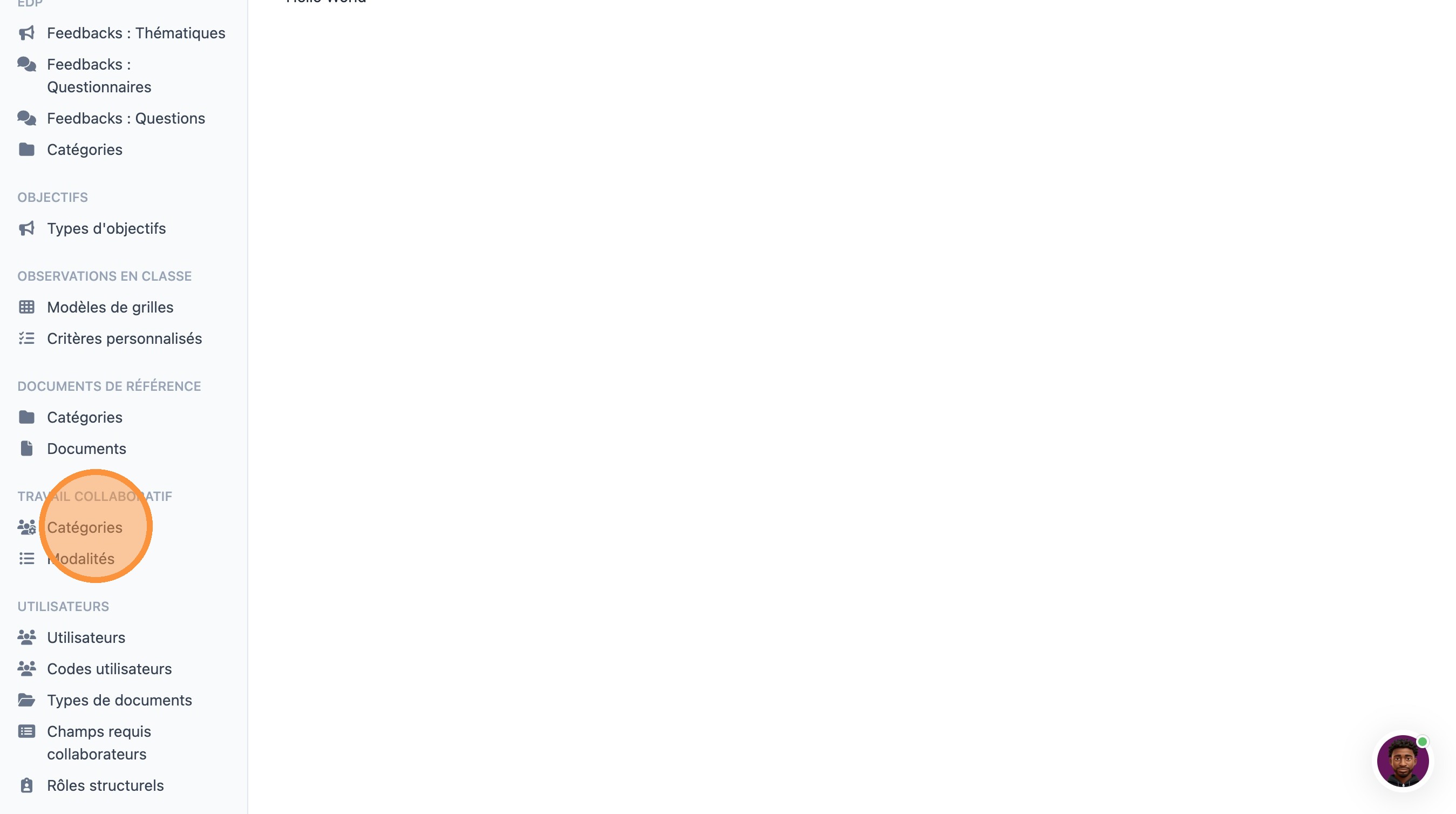 1. Dans le menu ADMIN ORGANISATION, sous la rubrique TRAVAIL COLLABORATIF, vous trouvez le menu CATEGORIES. Cliquer sur ce menu.