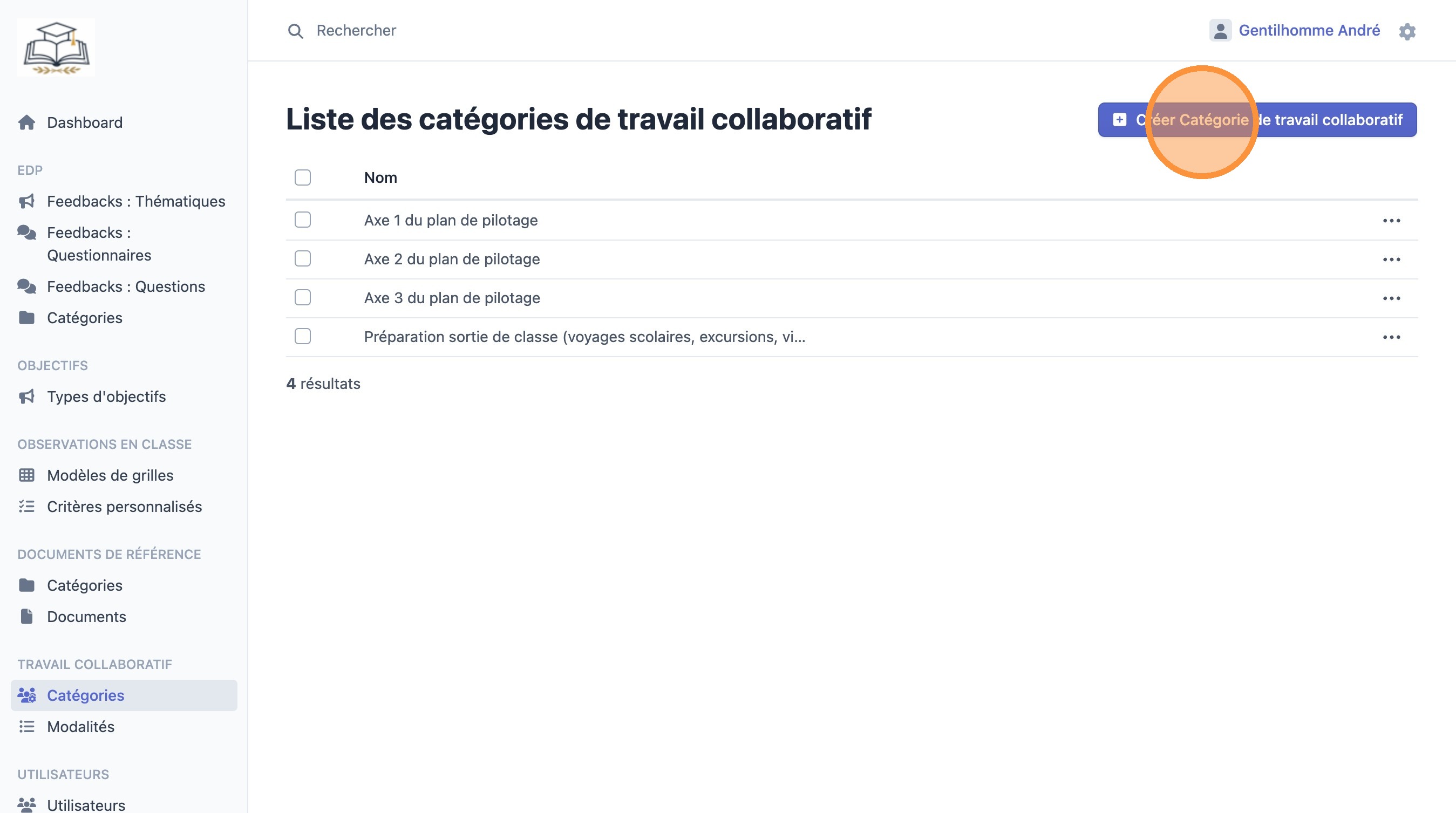 2. Cet écran affiche la liste des catégories. Pour modifier ou archiver une catégorie, cliquer sur les 3 points au bout de la ligne. Pour créer une nouvelle catégorie, cliquer sur "Créer Catégorie de travail collaboratif"
