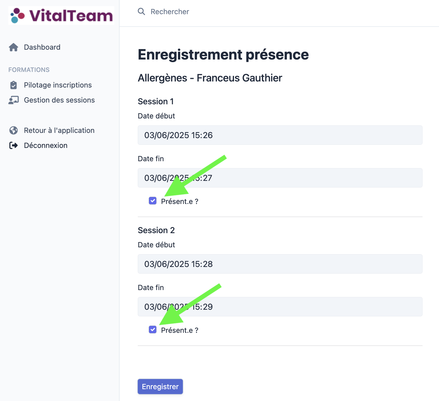 - Si la personne a participé, cliquez sur le bouton vert "Confirmer présence". Vous arrivez sur un écran où vous allez devoir valider les présences session par session. S'il n'y a qu'une session, c'est simple, il suffit de valide la présence à la session. Par contre, il est possible que la formation soit composée de 2 sessions ou plus : une journée le lundi et une journée le mardi par exemple. Ou une session le matin et une session l'après-midi. Si la personne a participé à tout, vous laissez la case "Présent·e" cochée (puisque par défaut, la case est déjà cochée) et vous enregistrez grâce au bouton enregistrer. Par contre, si la personne était absente une ou plusieurs sessions, vous décochez la case "Présent·e" aux sessions auxquelles elle n'a pas assisté. Cliquez sur ENREGISTRER pour valider.