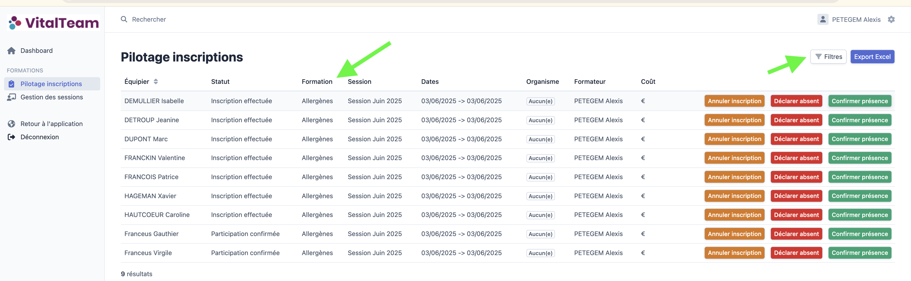 Lorsqu'une session de formation est passée, le formateur ou la formatrice peut encoder les présences ou les absences à la formation.