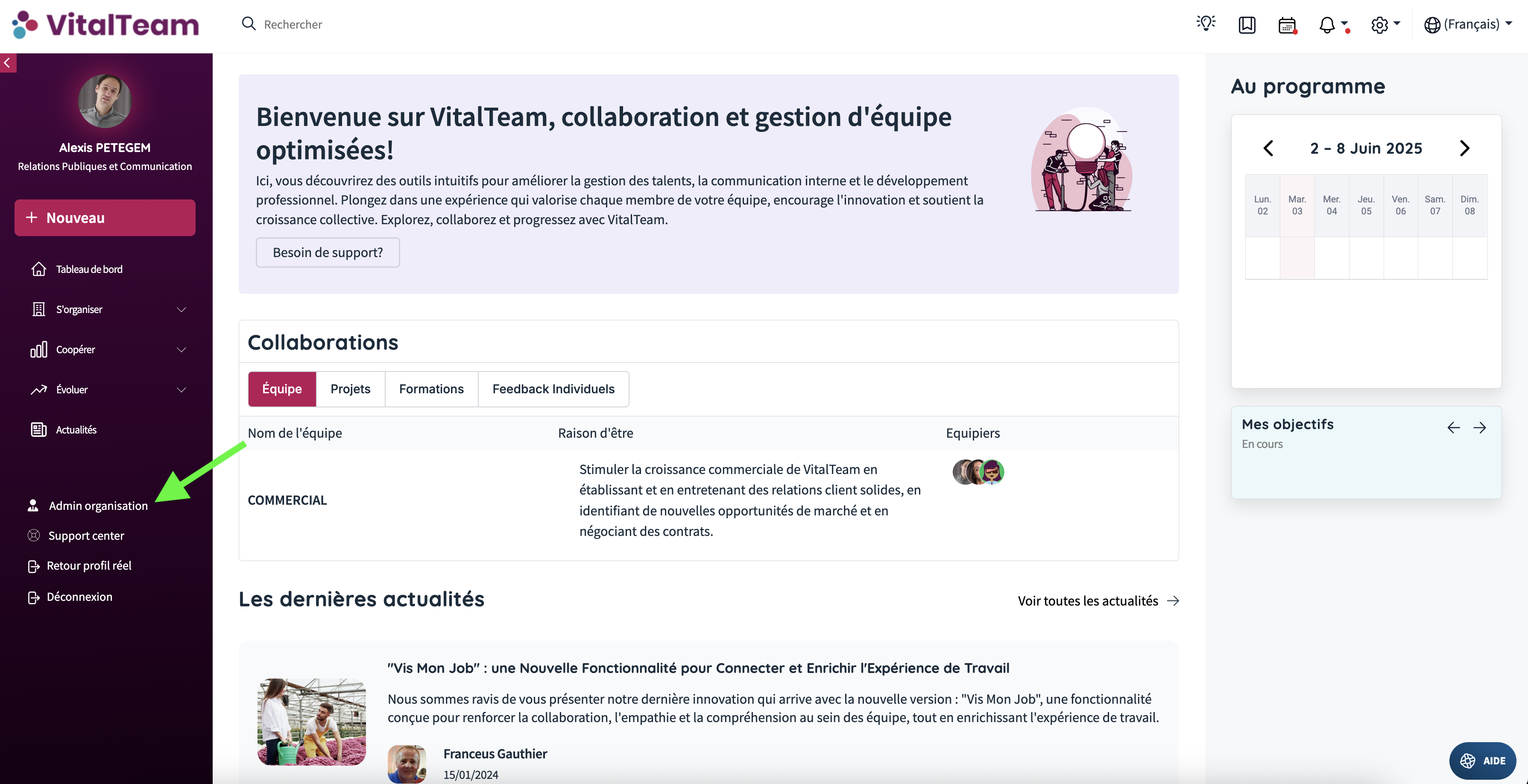 - Dans la colonne de gauche, cliquer sur ADMIN ORGANISATION (si vous ne voyez pas ce menu c'est que les droits ne vous ont pas été accordés. Rapprochez vous de l'administrateur VitalTeam au sein de votre entreprise).