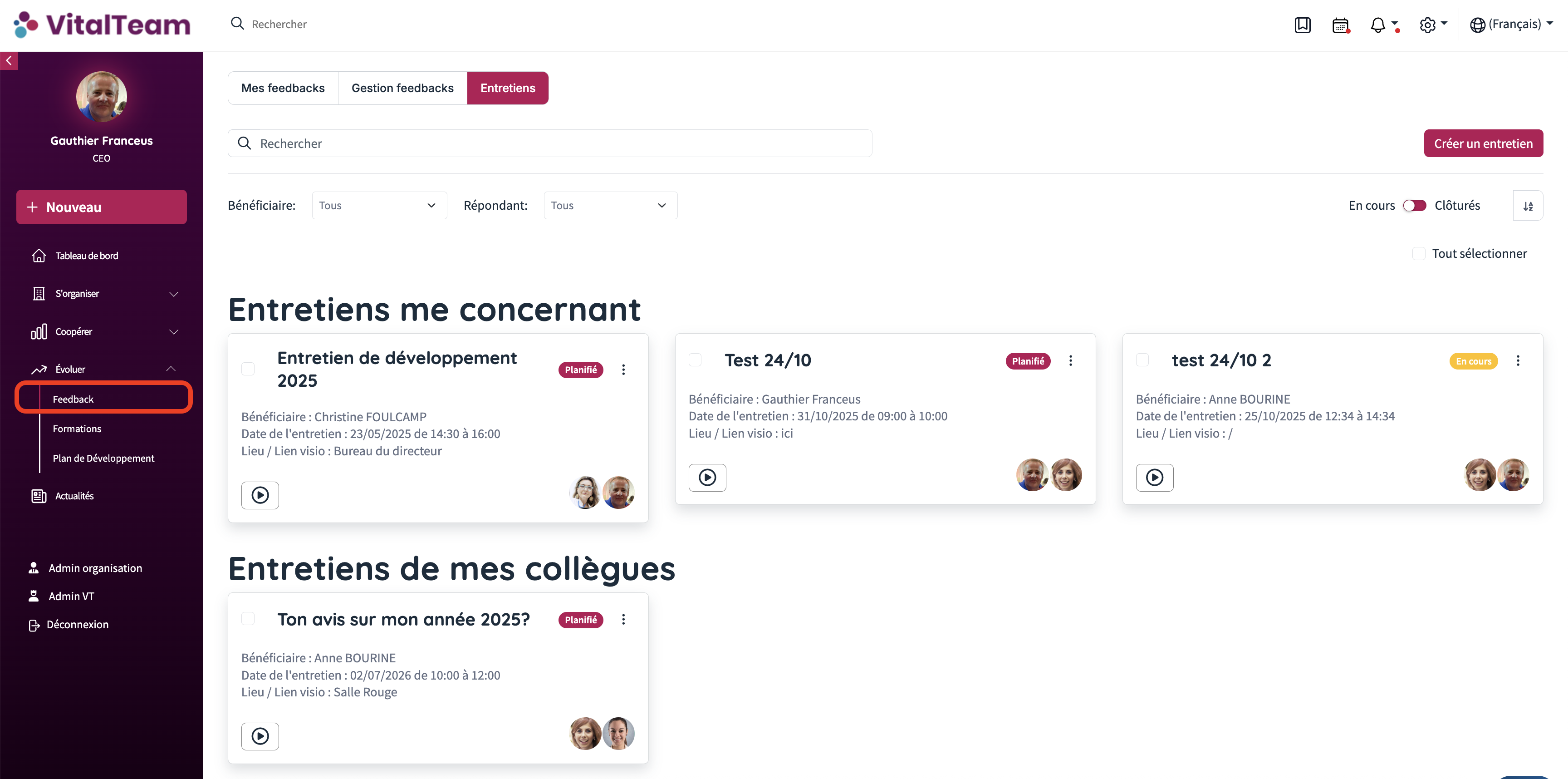 L'onglet Entretiens est accessible via le point de menu Feedback sous le menu EVOLUER.