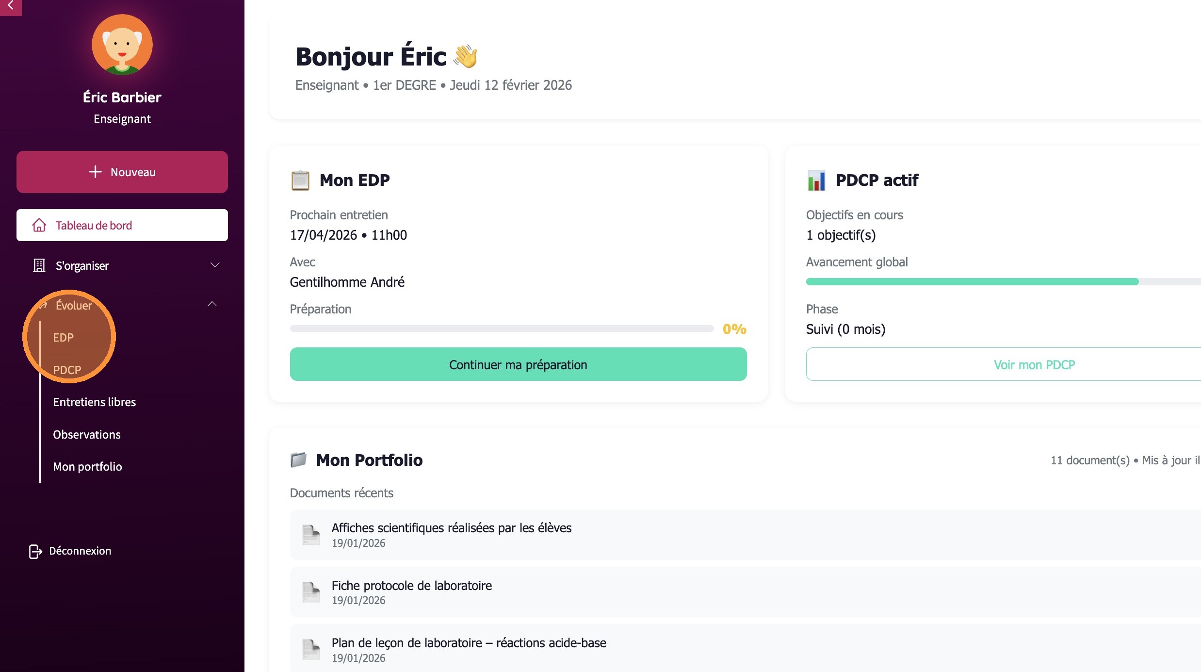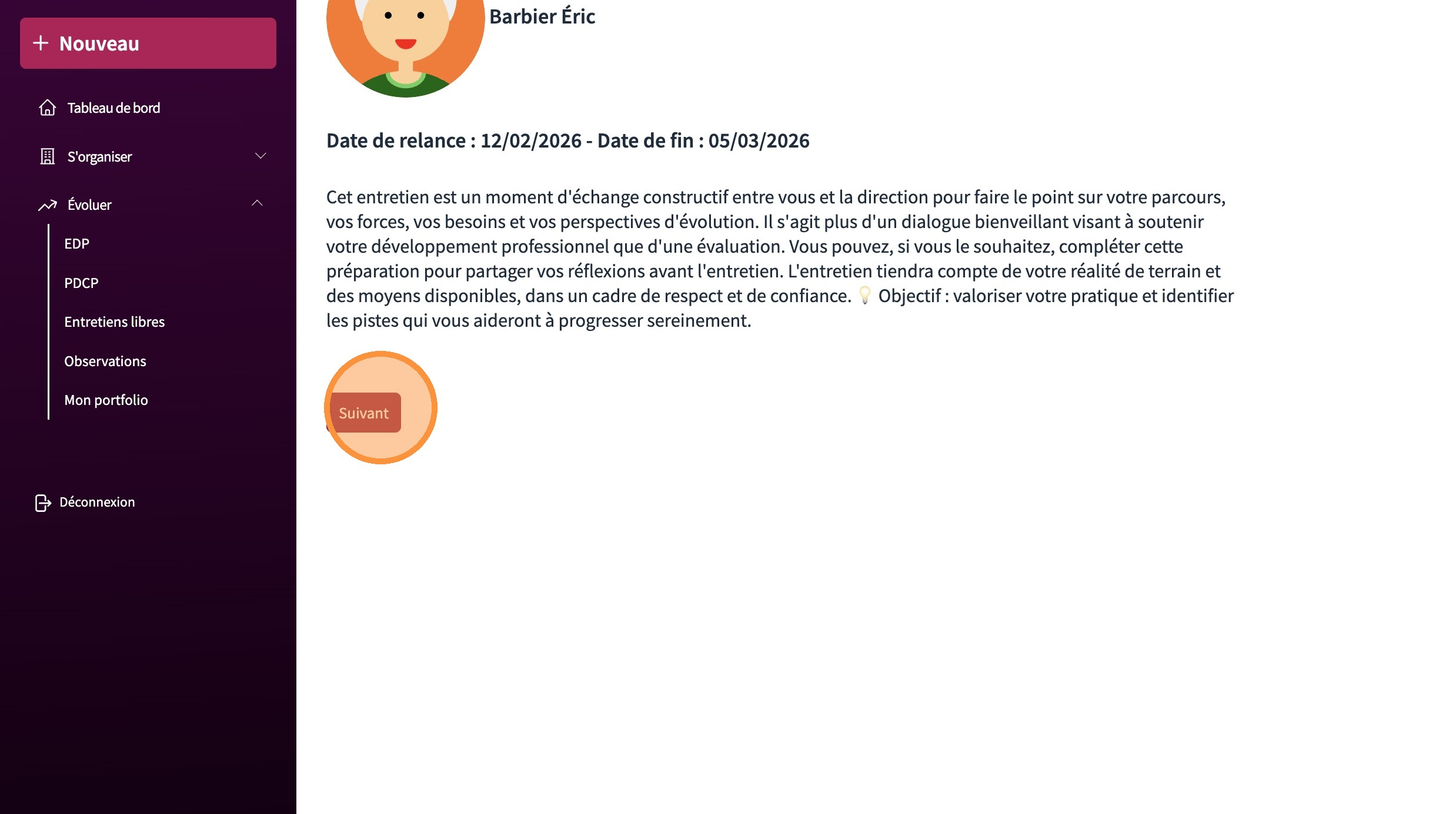 1. Lorsque la direction a créé votre EDP, vous recevez un courrier électronique dont l'objet est "Préparez votre entretien de développement professionnel (EDP)". Ce courrier contient un lien qui vous amène directement vers la page contenant l'EDP à préparé. Vous pouvez néanmoins naviguer vers cette page en Cliquant sur le menu "EDP" sous "EVOLUER" ou en cliquant sur "Continuer ma préparation" sur le tableau de bord (écran d'accueil).