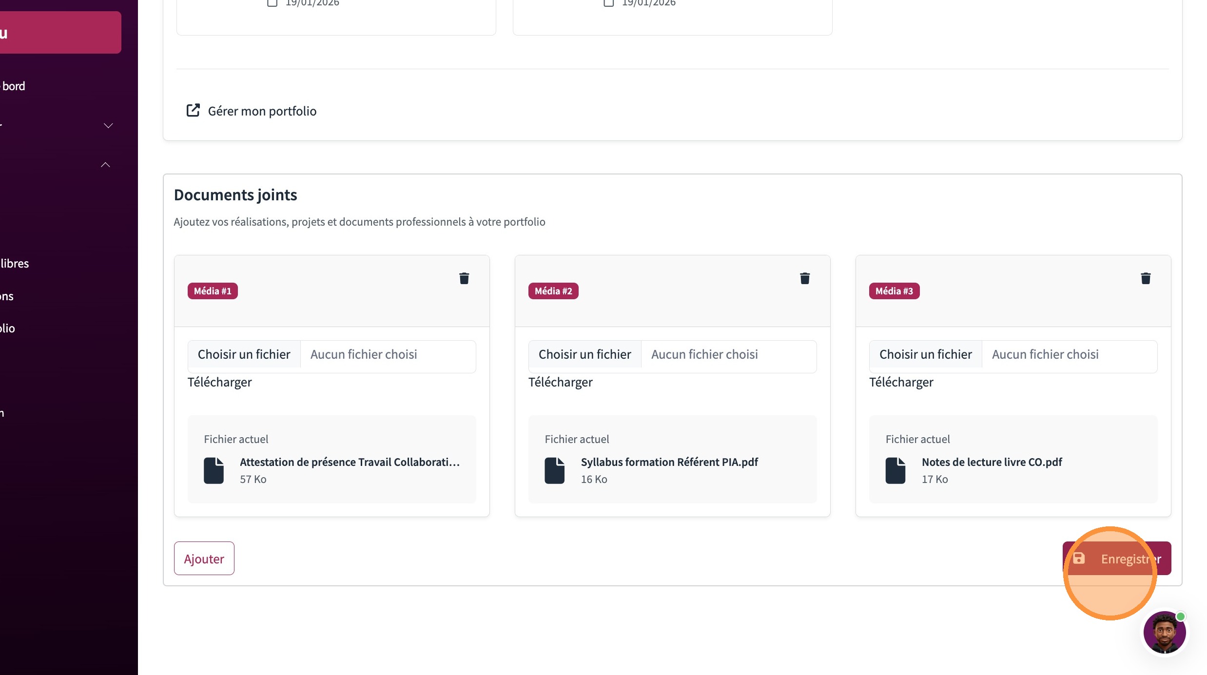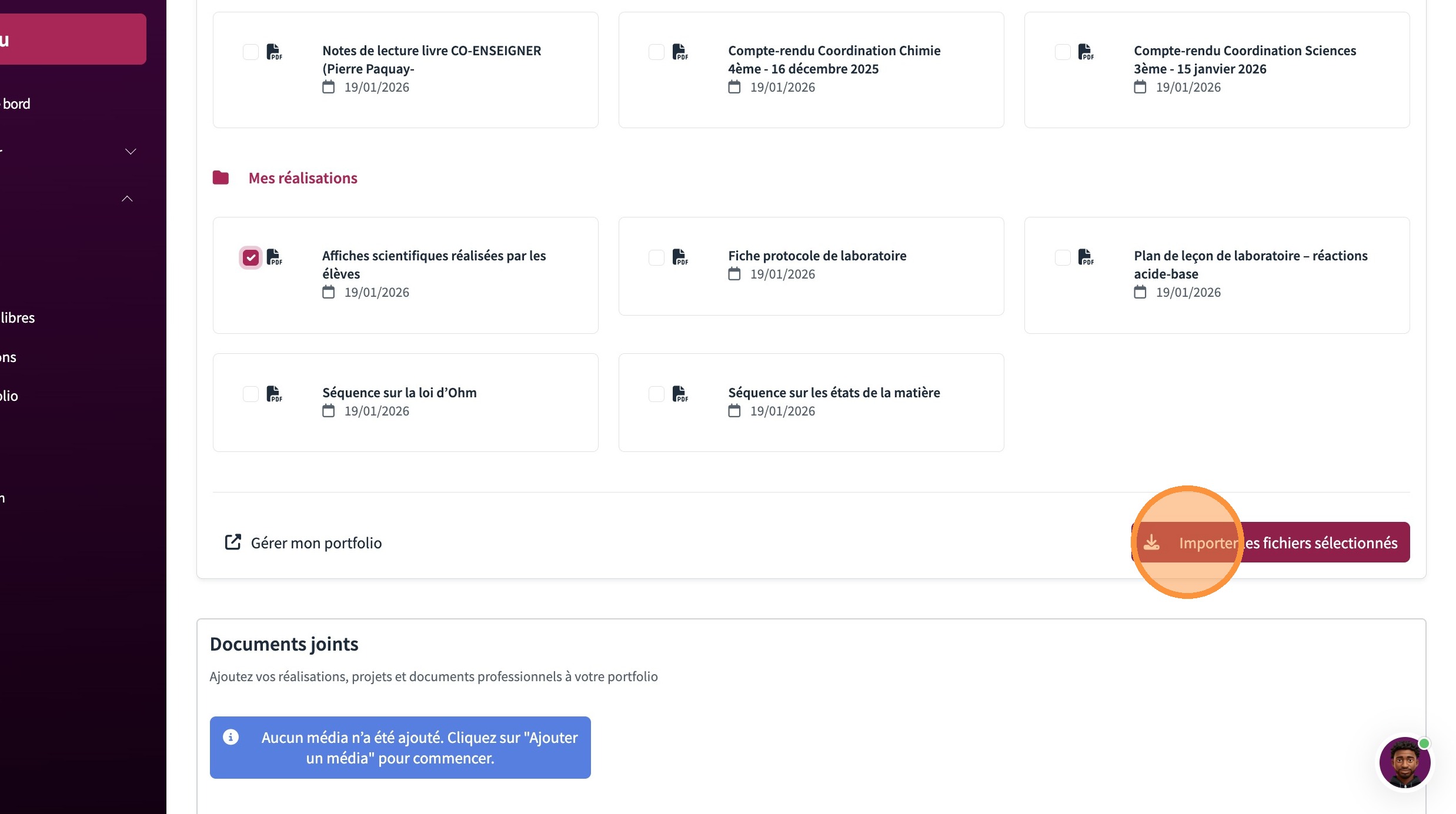 12. L'étape suivante consiste à l'intégration de documents de votre portfolio dans l'EDP. Si vous souhaitez montrer des documents de votre portfolio lors de l'EDP, sélectionnez-les ici et cliquez sur le bouton IMPORT. Le rapport comprendra le nom et le type du fichier importé.