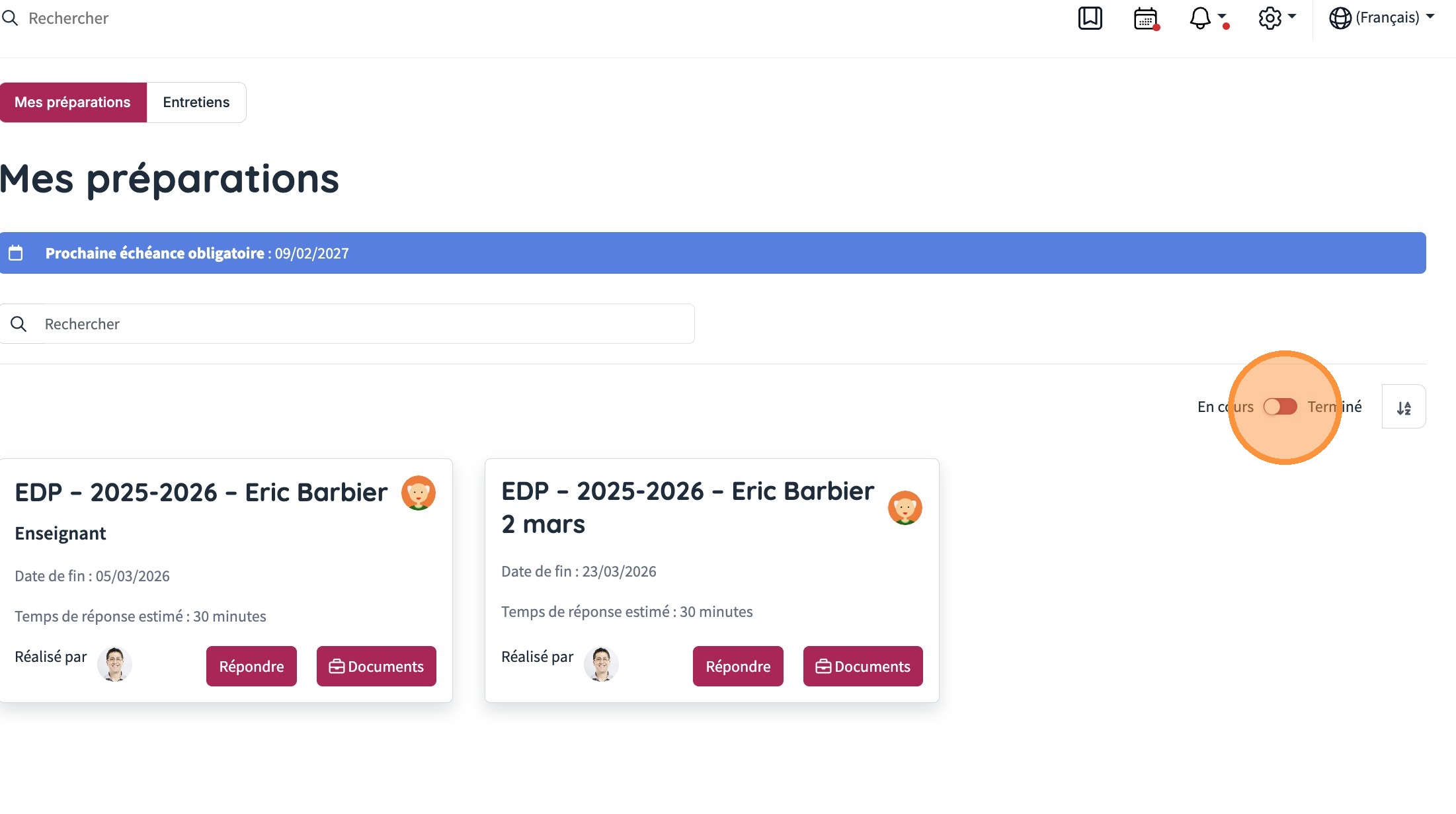 2. Vous voyez les éventuelles préparations en cours. Pour retrouver une préparation terminée, switchez le bouton sur "Terminé".